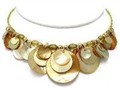 Snäckskal och paljetter i guld. Kedjan är en pärlprydd vajer och läggs runt halsen..
